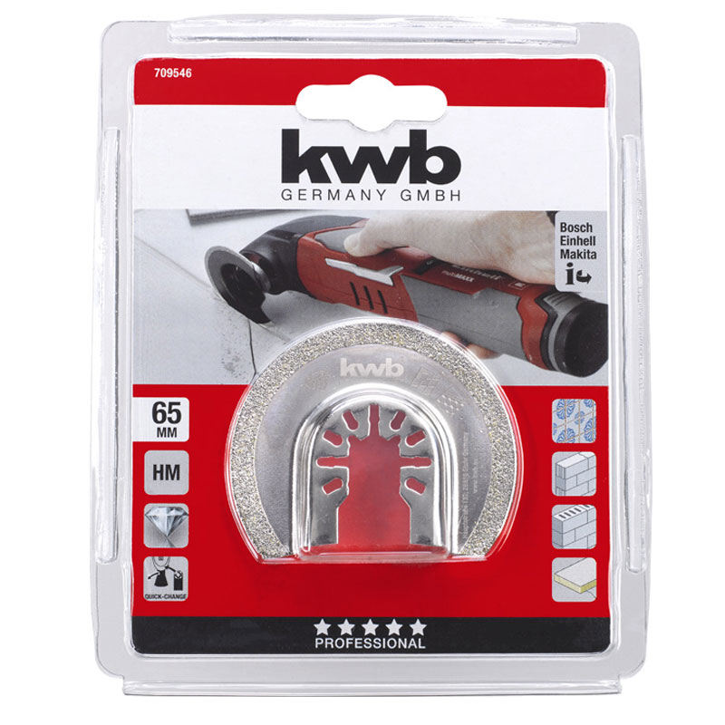 Lama diamantata semicircolare per multifunzione Kwb con attacco universale, larghezza di 65 mm e profondità di taglio da 12 mm.