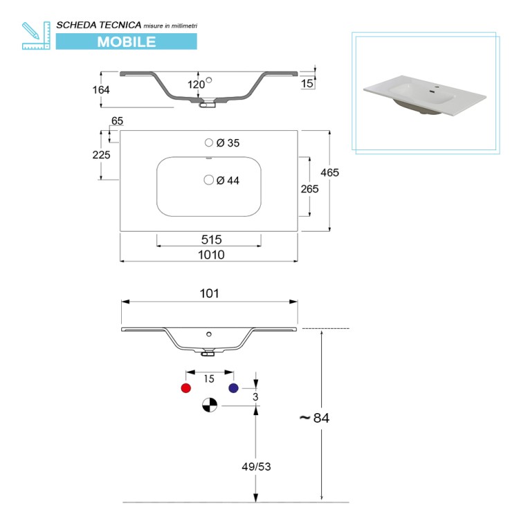 Dimensioni interne lavabo LxHxP: 51,5x26,5x12.5x cm