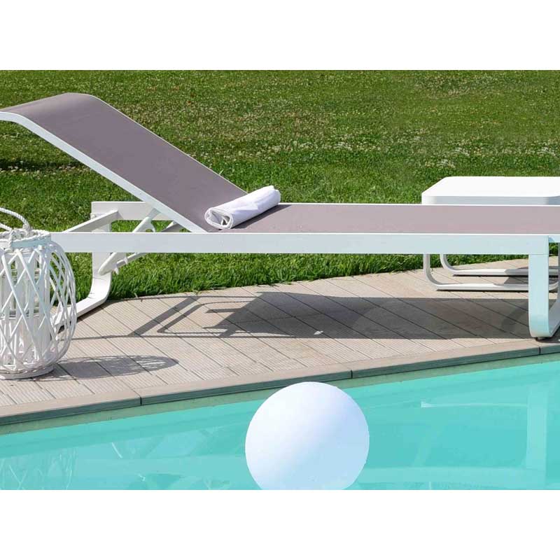 Il tessuto in textilene, resistente agli agenti atmosferici e traspirante, è stato scelto per garantire il massimo comfort all'utilizzatore. Lo schienale è reclinabile in 5 diverse posizioni, per permettere all'utente di trovare la posizione più adatta per rilassarsi o prendere il sole.